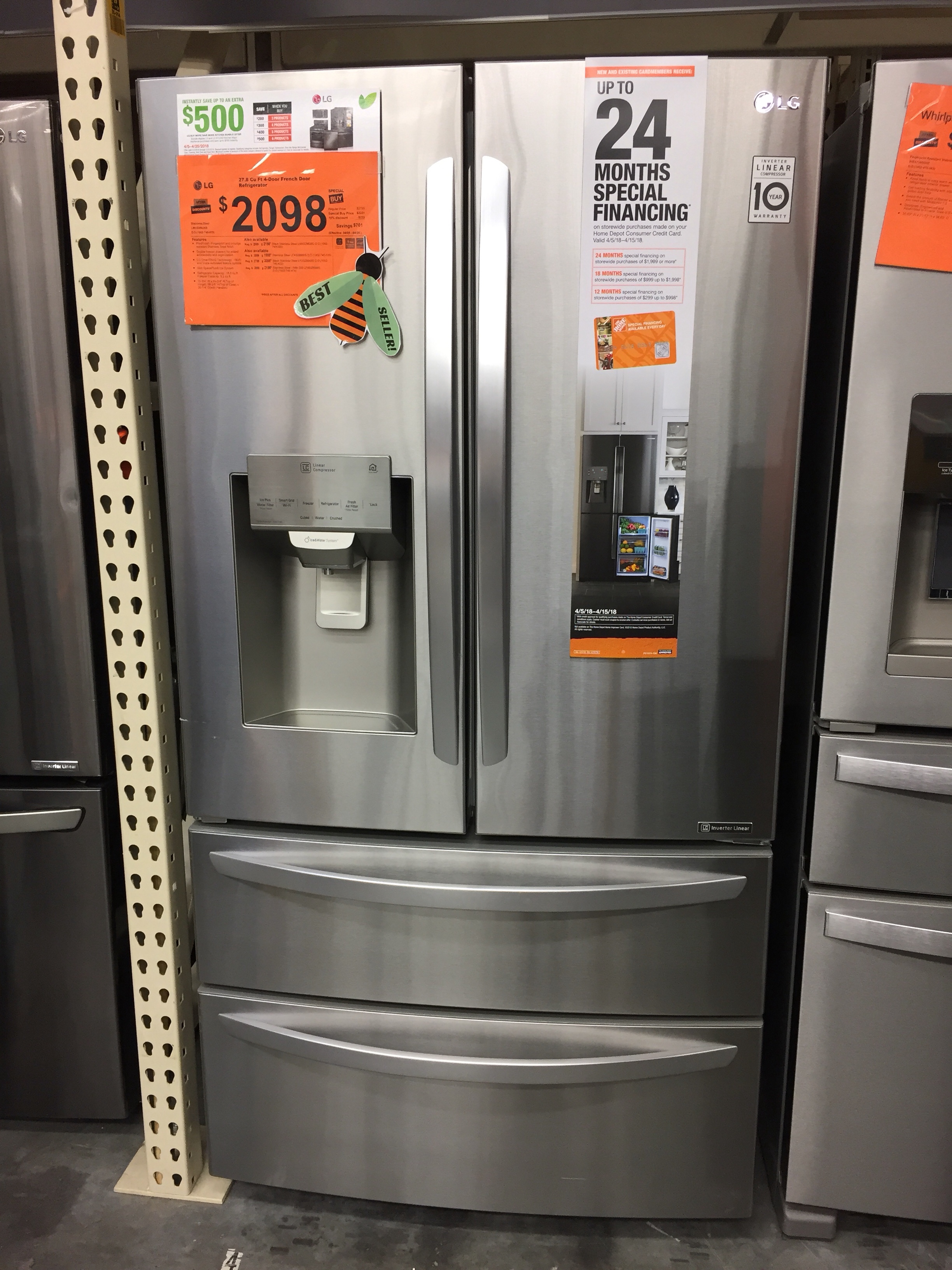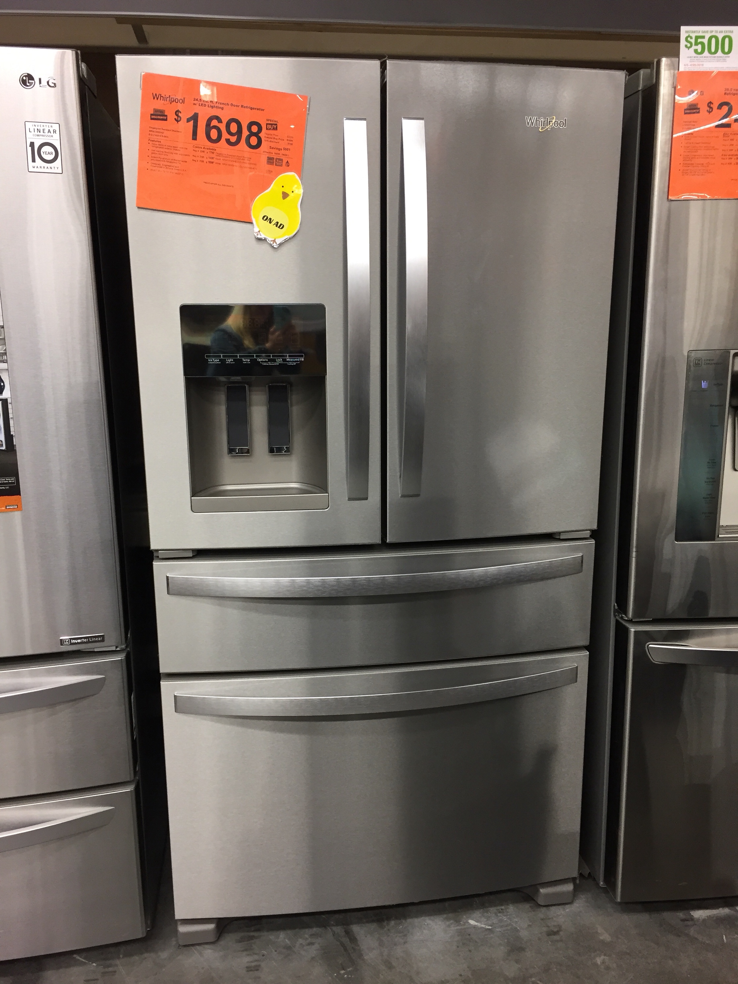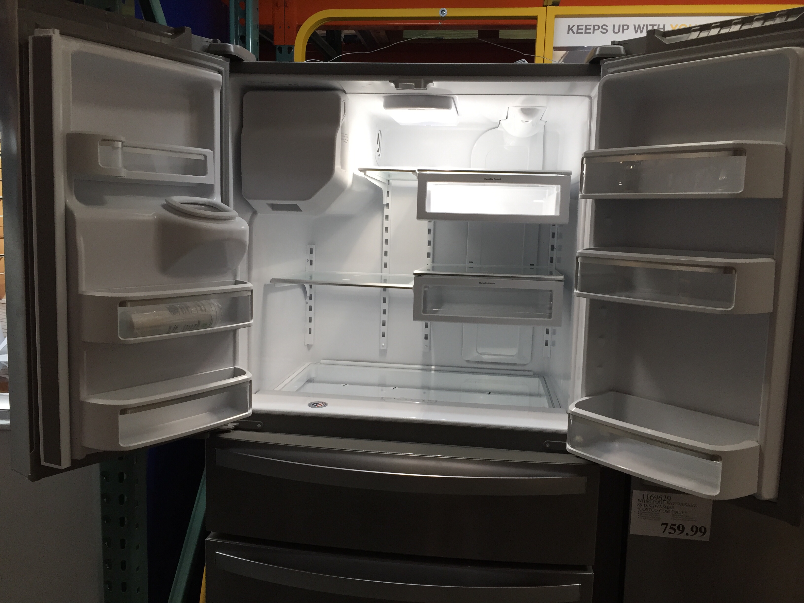 These French door refrigerators have so many great features, but check out the tiny shelf up high to make room for the ice maker….it seems a little awkward.