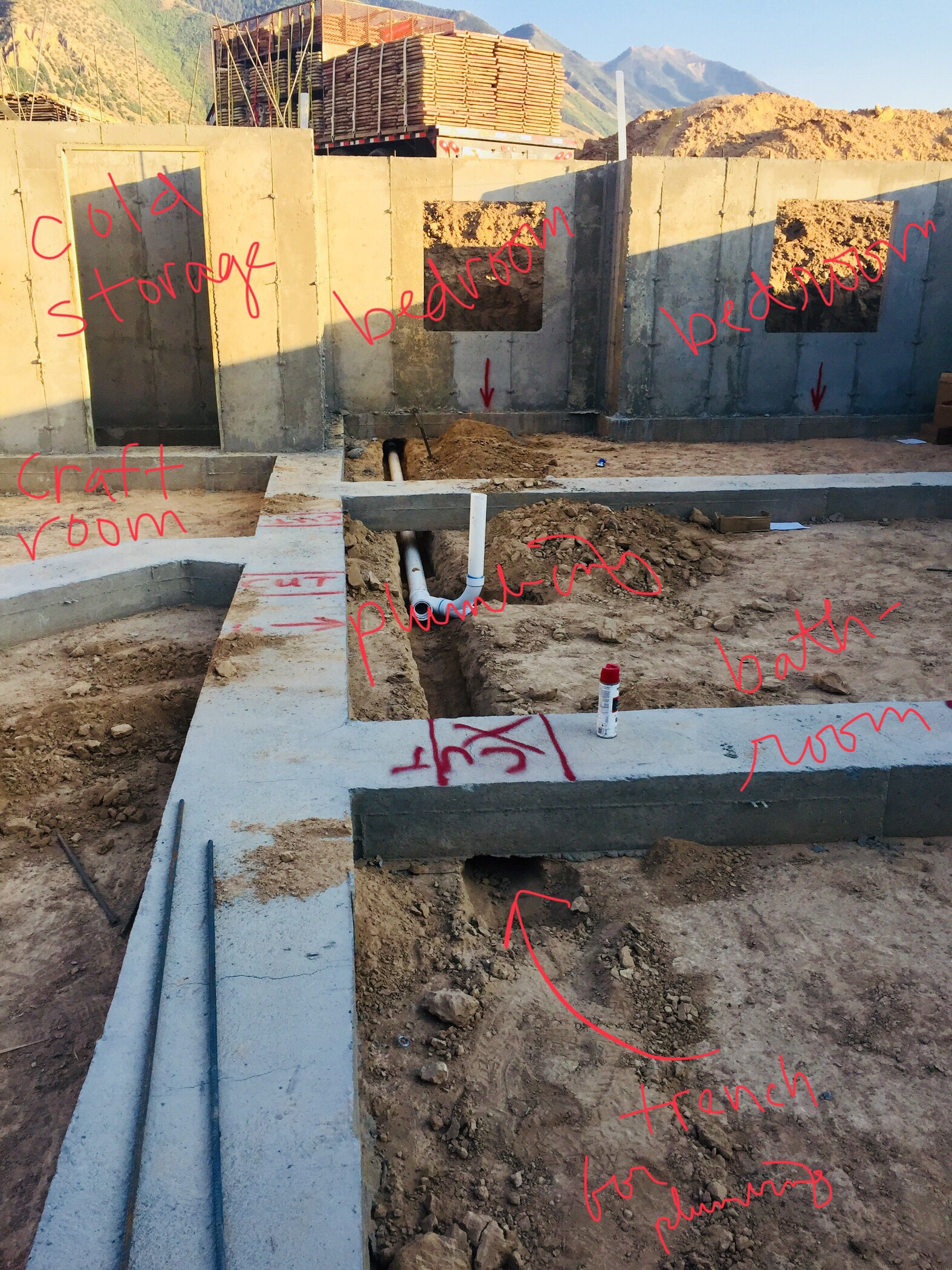 In the photo below you can see the trench he dug. You can also see some other features I labeled for your convenience. It might be hard to read….look for 2 bedrooms, the craft room, cold storage, a bathroom, and a trench for the plumbing and Waldo.